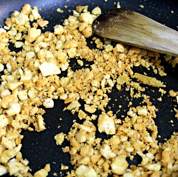 1.- En primer lugar vamos a elaborar una especie de pangrattato, pero sin añadir ajo o alguna hierba, Simplemente vamos a machacar pan duro y lo vamos a tostar con un poco de aceite en una sartén muy caliente, queremos que se tueste un poco, que no se empape de aceite y que nos de una textura crujiente al plato final. Cuando se dore, retiramos sobre papel absorbente.