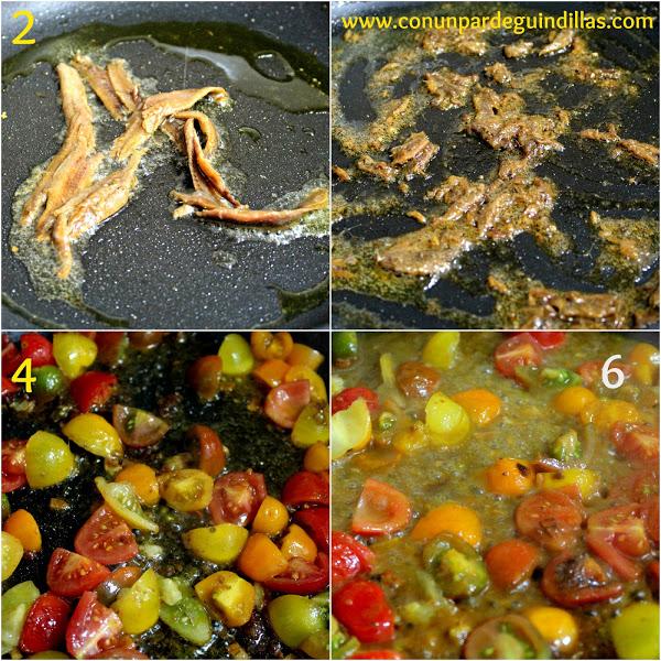 4.- Cuando las anchoas estén casi deshechas, añadimos 3/4 partes de los tomates Cherry cortados por la mitad y esperamos a que se vayan cocinando y ablandando soltando agua. Removemos con la cuchara de madera y reservamos los otros tomates.