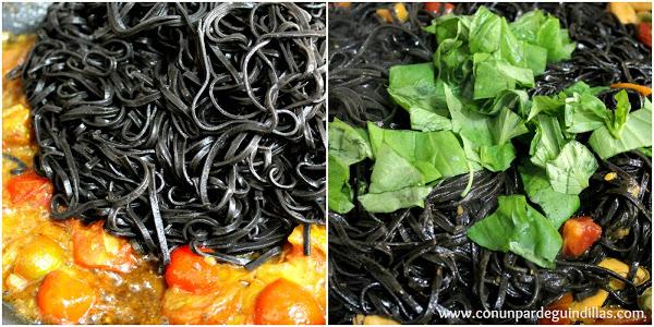 Este tipo de pasta suele, como es lógico, consumirse con salsas o ingredientes marineros y con verduras u hortalizas que contrasten vivamente con el intenso color negro. Me encanta utilizarla para conseguir contrastes cromáticos con tomates, pimientos, gambas, etc...