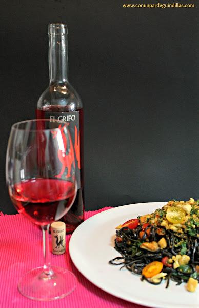 8.- A la hora de emplatar, por encima añadimos el pan tostado del primer punto y lo acompañamos de un estupendo vino rosado, por ejemplo, algún vino canario como éste "El Grifo", elaborado con uva Listán Negro y del que ya hablaremos