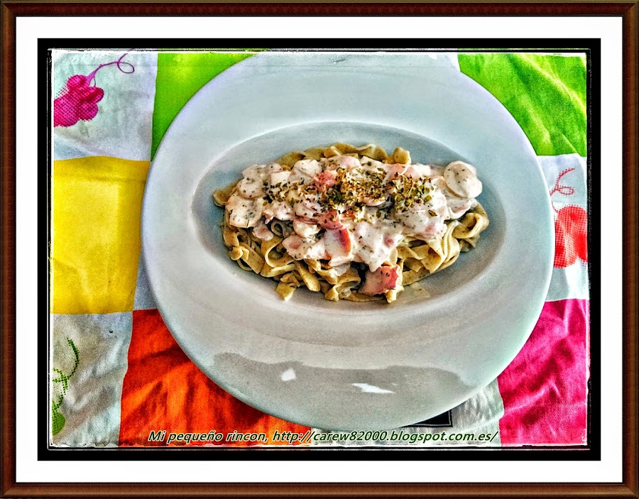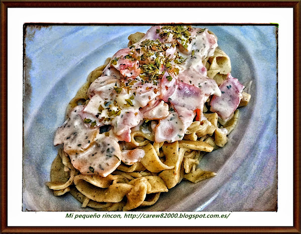 Ponemos agua en una cazuela con una pizca de sal y aceite y cuando comience a hervir añadimos nuestra pasta y una vez que empiece a flotar la dejamos unos 6 minutos más , la sacamos y la refrescamos y servimos sobre un plato , yo utilizo un plato hondo de la fábrica de vajillas de porcelana Porvasal , y ponemos unas cucharadas de la salsa de nata (crema de leche) por encima , es muy importante servir este plato caliente , para que la salsa se mezcle bien con la pasta.