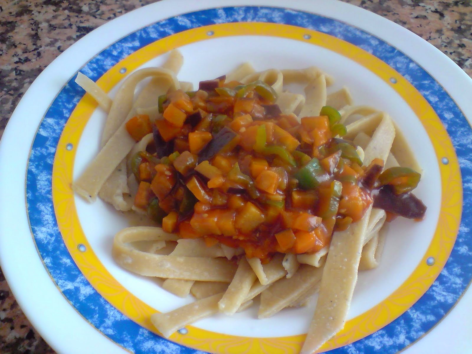 Picamos el ajos, el pimiento y la berenjena por separado muy fino. En un cazo ponemos unas tres o cuatro cucharadas de aceite y añadimos el ajo. Cuando esté dorado añadimos el pimiento y un minuto después la berenjena. Rehogamos muy bien y echamos el vino blanco y la sal. Tapamos y dejamos a fuego medio hasta que la berenjena esté blandita. Añadimos el tomate y calentamos hasta que veamos que borbotea. Colocar sobre la pasta o llevar a la mesa para que cada uno se eche lo que quiera.