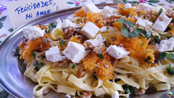 3.- Cocemos los tagliatelle: En un caldero ponemos agua a hervir con sal y una hoja de laurel duaren 5 o 6 minutos o siguiendo las instrucciones del fabricante. Los escurrimos bien, mezclamos la pasta con el marinado que hemos hecho anteriormente. Añadimos los trozos de calabaza asada, el queso feta cortado en dados medianos, las nueces, las pipas de calabaza y las pipas de girasol. Servimos inmediatamente.