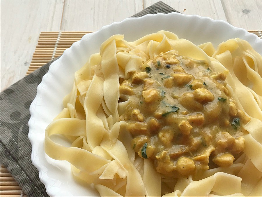 6. Entre tanto, ponemos a calentar una olla grande con agua y sal y cocemos los tagliatelle, siguiendo las instrucciones del envase. Cuando estén hechos, escurrimos y servimos con el pollo al curry.