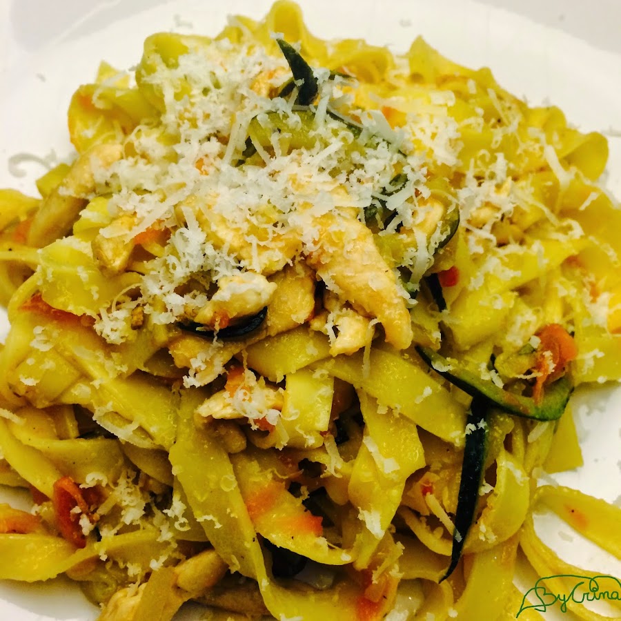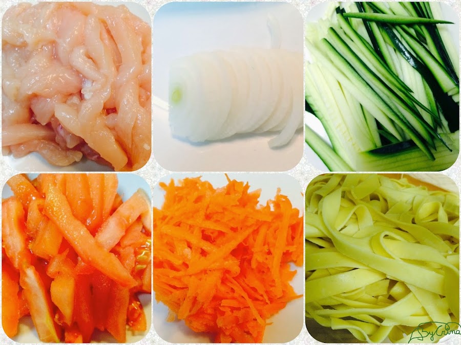 Cut all into thin strips. Place a pan over medium heat and add 3 tablespoons of oil, let it heat and sauté the chicken. When it is browned, reduce heat and sweat the onion, zucchini, tomato and carrot. Add salt and pepper to taste.