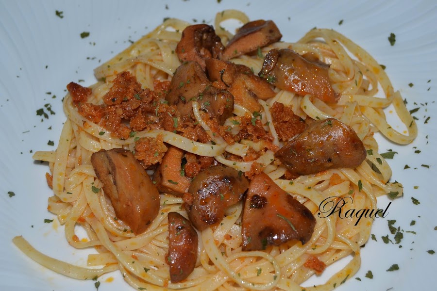 Hoy preparo un plato de pasta con unos rovellons, níscalos(se laman así fuera de Cataluña) que tenia en el congelador ya preparados de una anterior vez que los cocine, pero con un ingrediente que nunca he usado fuera de los bocadillos, bueno si en los huevos al plato pero ya esta ninguno mas, la sobrasada de Mallorca.