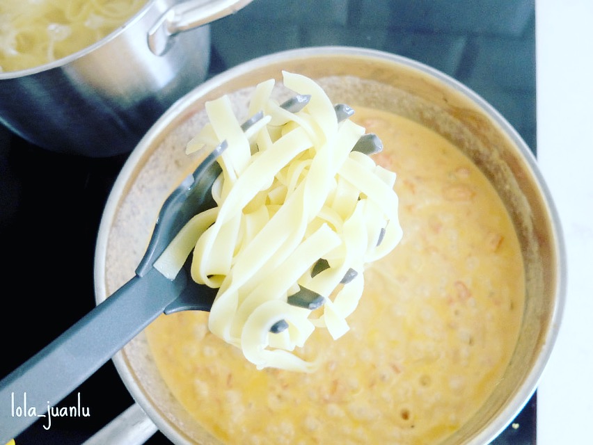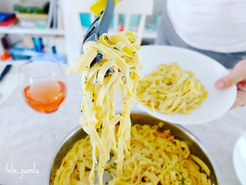 Comprobamos que la pasta está al dente y la añadimos a la sartén. Removemos hasta que quede bien integrada. Apartamos del fuego y espolvoreamos un poco de perejil por encima.