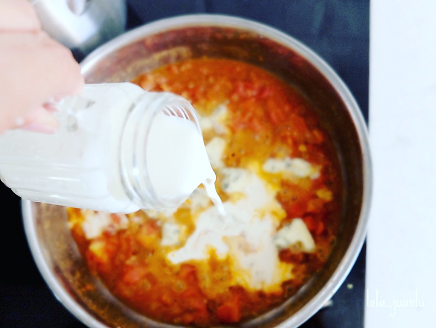 Añadimos el queso y la nata (crema de leche), no dejamos de remover hasta que el queso se funda y la nata (crema de leche) se integre con el resto de los ingredientes.