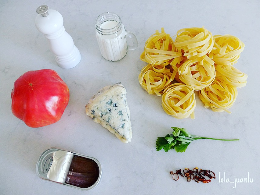 Los ingredientes que necesitamos para preparar unos deliciosos tagliatelle con salsa de anchoas, tomate rosa y queso azul, para dos personas, son los siguientes: