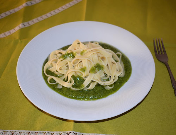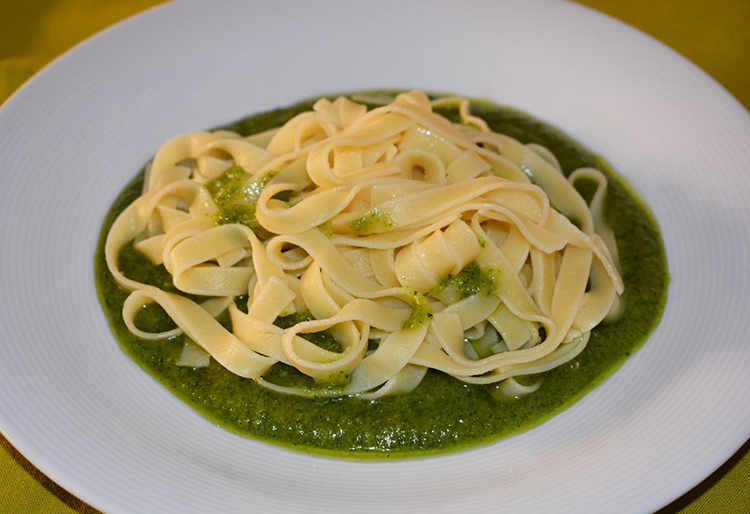 Servimos en caliente poniendo en cada plato una base de pesto, encima la ración de pasta tagliatelle y rociaremos por encima con un poco de salsa pesto.
