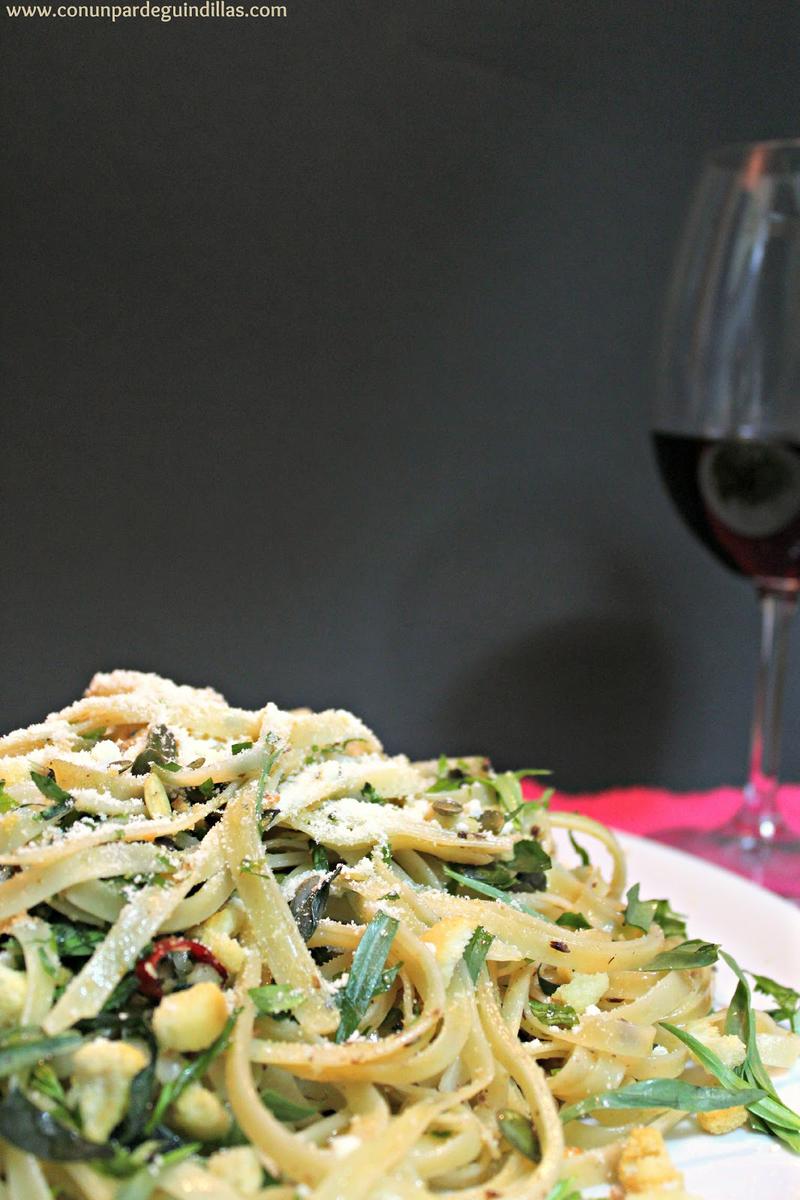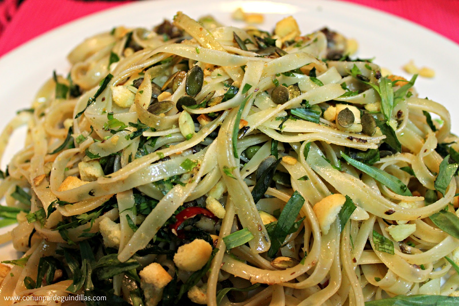 4.- Movemos, rompemos las sardinas y añadimos la pasta cocida con una cuchara del líquido de cocción, un puñado de pipas de calabaza y el estragón picado.
