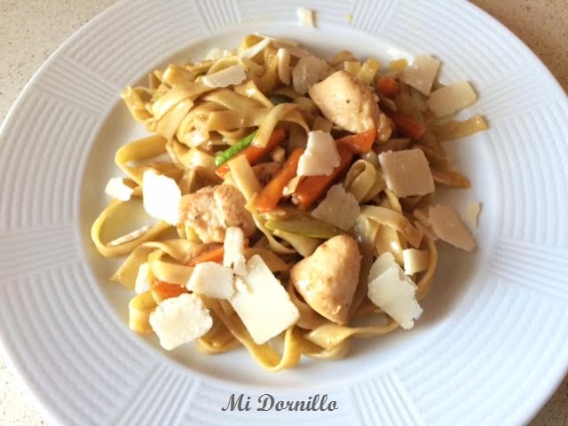 Escurrir la pasta y añadirla a la verdura y el pollo.