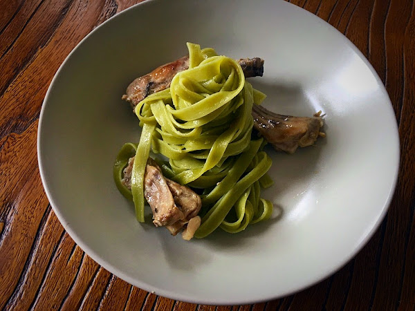 De una receta salen dos. Si tienes pensado hacer un conejo al ajillo, como el que hicimos aquí hace poco, y ponerle algún tipo de guarnición, una opción es la pasta. En este caso Tagliatelle de espinacas que en casa usamos bastante porque son los preferidos de la peque. Y ya se sabe que los pequeños siempre mandan. Simplemente rehogando la pasta en el minuto final con el conejo al ajillo, encontraremos un sabor bien rico en los tallarines y acompañará perfectamente a la carne. Bien rico todo.