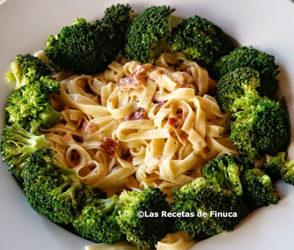 Mientras, en una sartén sin aceite freímos ligeramente el bacon cortado en trozos pequeños. Añadimos la nata (crema de leche), un poco de sal y pimienta negra molida. Dejamos que se haga 8 minutos revolviendo de vez en cuando. No conviene dejarla espesar demasiado. Ponemos los tagliatelle, bien escurridos, sobre la salsa y mezclamos bien. Echamos en una fuente y colocamos alrededor el brócoli. Servimos muy caliente.