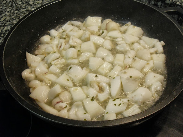 Una vez frito el tomate agregamos la sepia y el calamar sofrito y agregamos el fumet y lo dejamos cocer unos 20 minutos más. Añadir los mejillones sin cáscaras y las almejas, desechando las que estén cerradas.