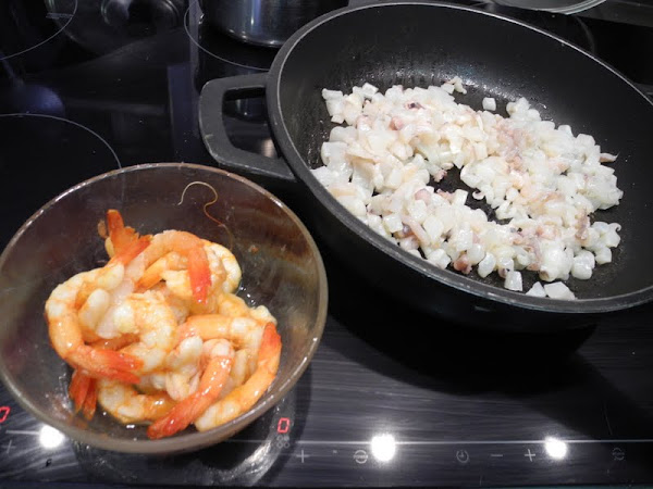 Escurrirla seguidamente y mezclar con el sofrito y las gambas.