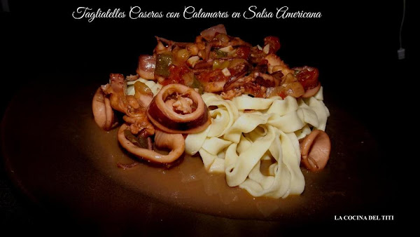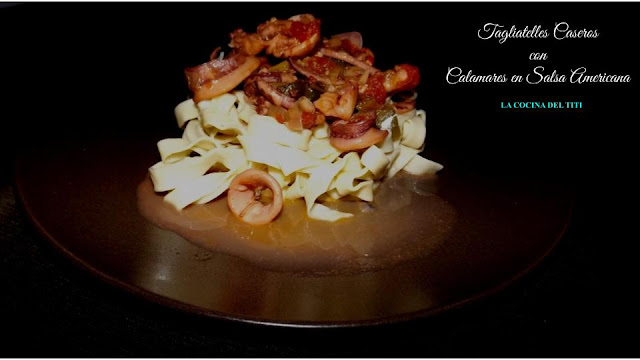 La pasta casera es diferente, se adapta de maravillas a cualquier tipo de salsa y en sabor es lo mejor. Hoy vengo como ya os habreis imaginado con unos "Tagliatelles Caseros con Calamares en Salsa Americana" la pasta como ya he comentado brutal pero la salsa para acompañar son unos calamares con un clasico de la cocina en el que un buen fondo de verduras, los calamares, un buen amontillado y un toque de pique es mas que suficiente para sacar una buena receta de pasta.