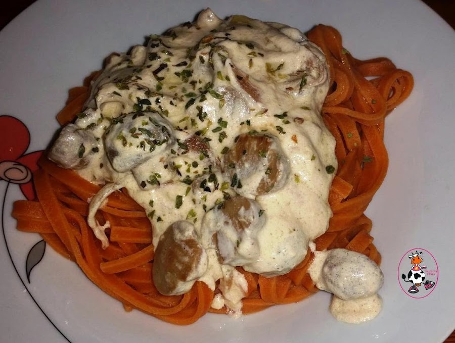 Ponemos una sarten al fuego con un chorrito de aceite de oliva y sofreimos la cebolla cortada en juliana. Cuando esté pochadita añadimos los champiñones enteros y laminados bien escurridos y dejamos que se doren un poco. Añadimos la nata (crema de leche),un poquito de sal,removemos un poco y cuando empiece a hervir apagamos el fuego. Yo puse la pasta en un plato y encima la salsa con un poco de orégano espolvoreado.