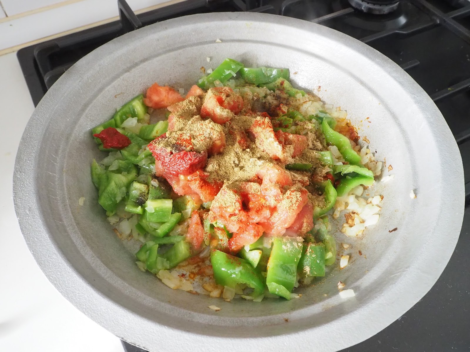 - Seguidamente, añadimos los tomates, el concentrado y las especias. Podemos añadir también una pizca de sal, pero poca porque el pescado ya está salado. Mezclamos bien y dejamos cocer hasta que se empiece a formar una salsa, removiendo de vez en cuando.