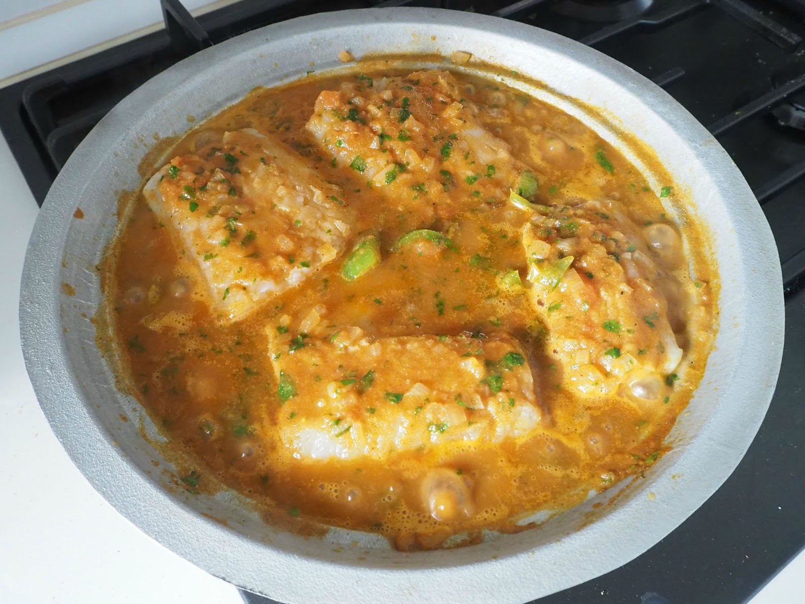 - Cubrimos los lomos de bacalao con un poco de salsa, tapamos y dejamos cocer a fuego medio, nunca muy fuerte, unos 10 minutos. Si vemos que va quedando muy líquido, destapamos los últimos minutos. Si por el contrario se queda espeso, añadiremos algo más de agua.