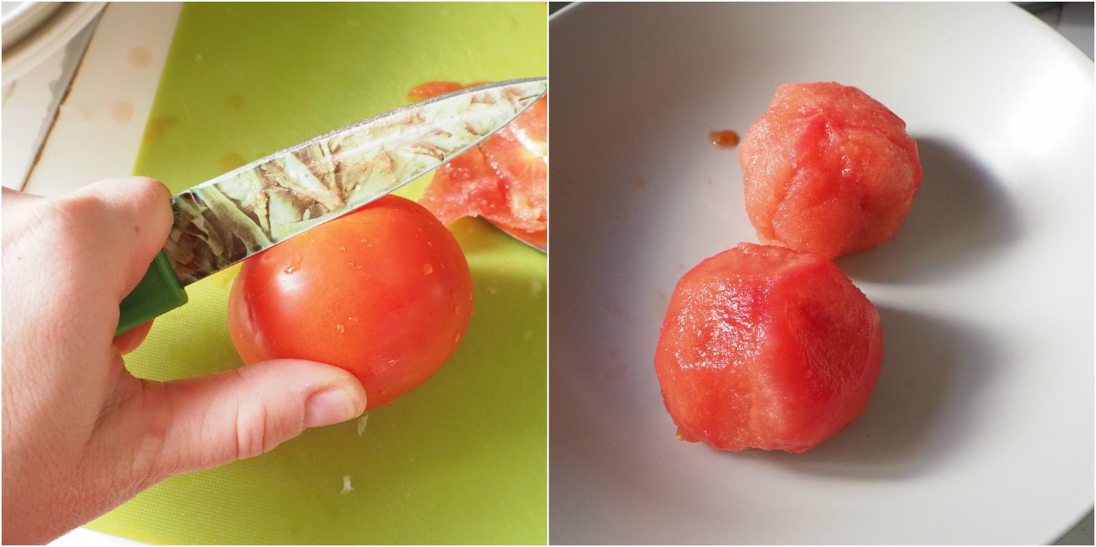 - Picamos la cebolla fina, cortamos el pimiento en trozos medianos, picamos el cilantro y, pelamos los tomates. Yo lo que hago es frotarlos con el canto de un cuchillo. Después la piel sale fácilmente. Una vez pelados, los cortamos en trozos pequeños.