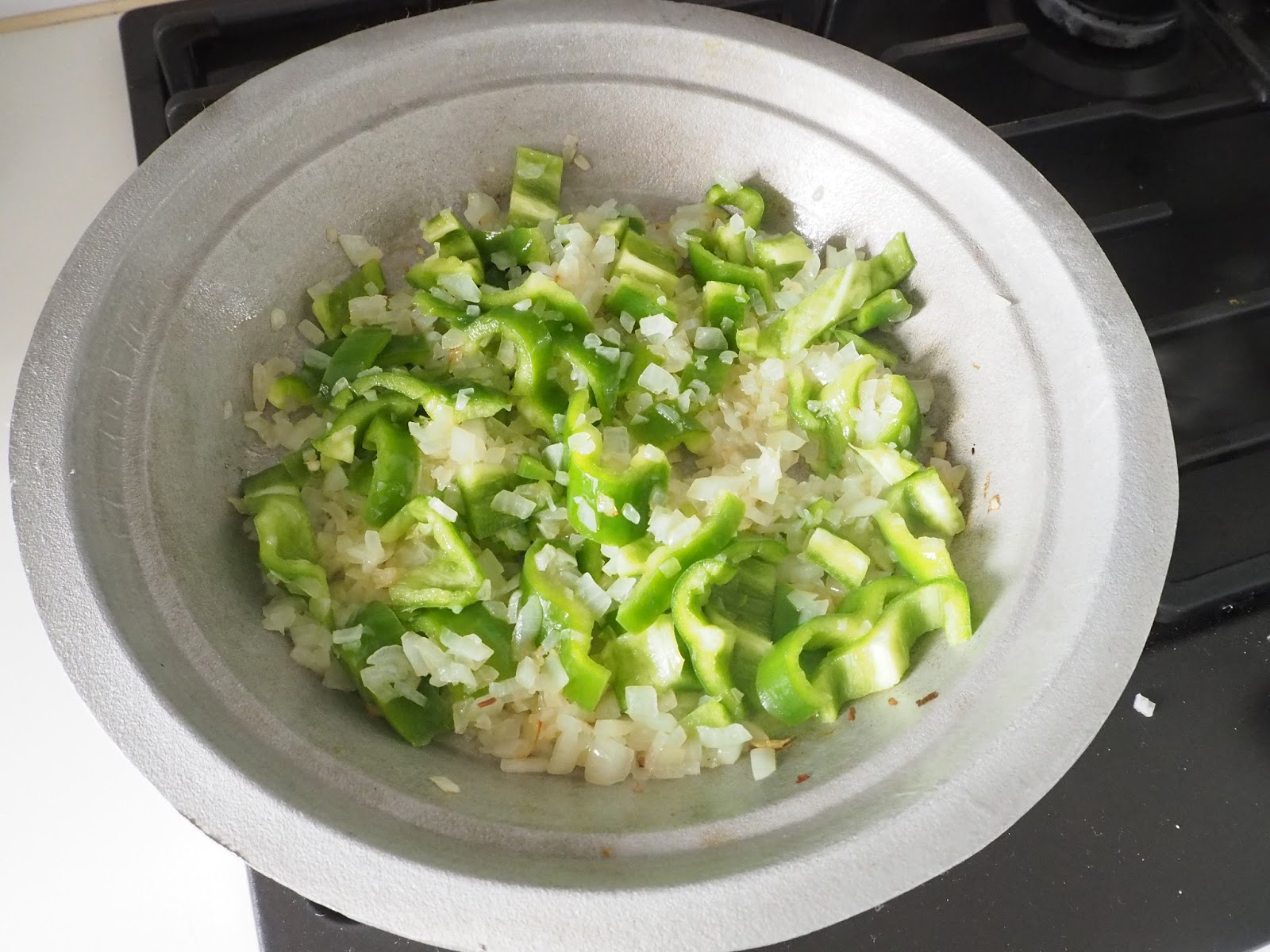 - Cuando empiece a estar tierna la cebolla, añadimos el pimiento. Removemos y dejamos cocer un par de minutos.