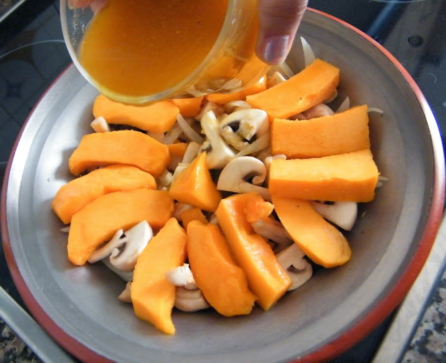 6. Colocamos las cuñas sobre la calabaza, centradas, y rociamos con el resto del agua y especias.
