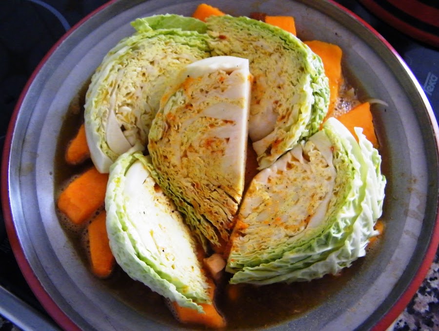 5. Ahora cortamos el medio repollo en 5-6 cuñas. Si las hojas de fuera están feuchas, las retiramos.