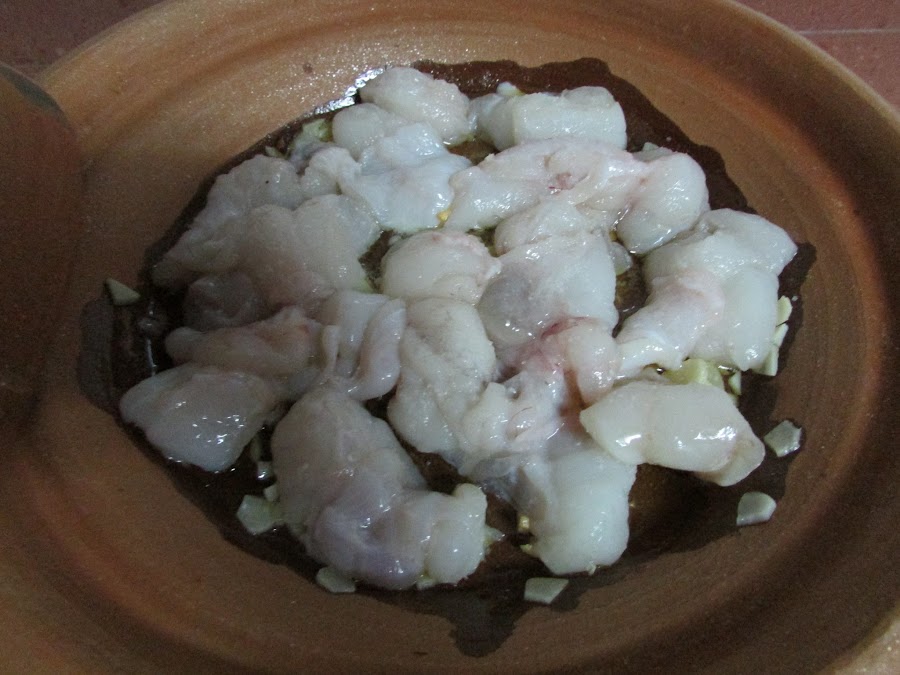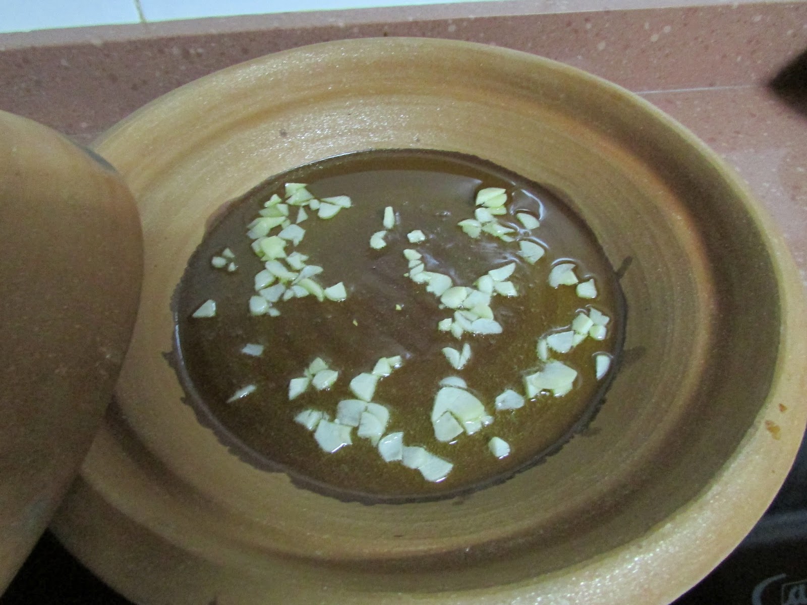 Ponemos el Tajin o cazuela al fuego con el aceite, los ajos secos laminados y la guindilla entera.