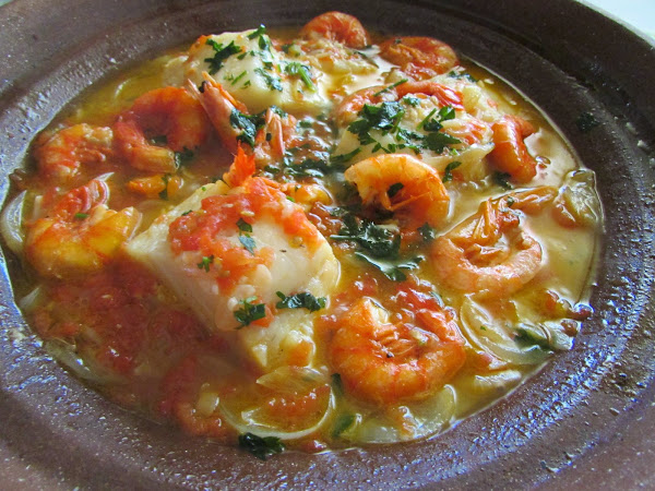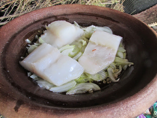 Ponemos el tajine o la cazuela en el fuego con un poco de aceite de oliva que cubra el fondo, echamos los dientes de ajo picados y las cebollas cortadas en juliana, le damos unas vueltas y cuando empieza a transparentar la cebolla añadimos el bacalao con la piel hacia abajo