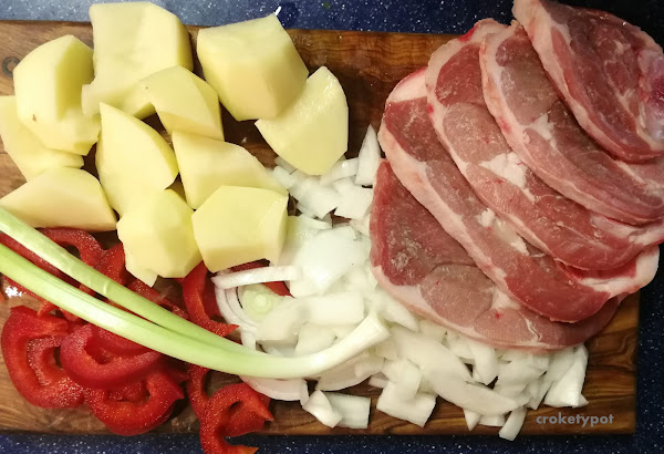 INGREDIENTES: 500 gr de filetes de pierna de cordero, 2 patatas, 1/2 pimiento rojo, 1 cebolla no muy grande, 2 ajetes, 2 cucharadas de aceitunas moradas, medio limón en salmuera, aceite de oliva AOVE.
