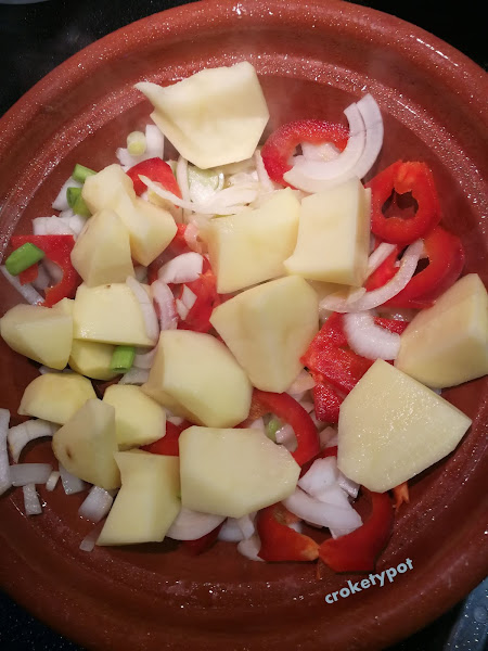 Se retira del tajine y reservamos. Añadimos la cebolla, el pimiento y la patata removemos 5 minutos.