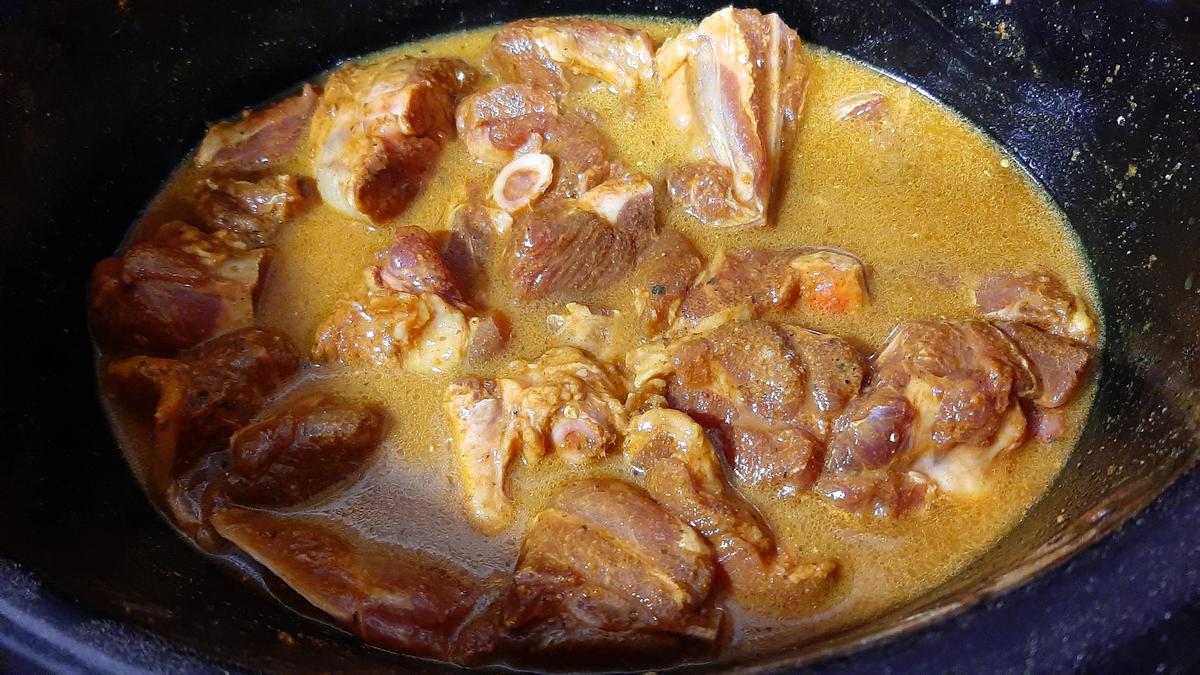 Yo he adobado la carne y la he dejado reposar en la nevera 2horas, ya que en mi cocina hace bastante calor. Pero si lees esto en invierno podrías perfectamente adobar la carne dentro de la propia olla de la Crock-Pot y dejarla reposar a temperatura ambiente tapada.
