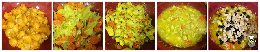 Para comenzar con la preparación, echamos un chorro de aceite de oliva en nuestro tajine y doramos el pollo que hemos marinado desde la noche anterior. Una vez dorado, lo retiramos y reservamos. En el mismo aceite, ponemos la cebolla cortada en juliana y la zanahoria cortada en rodajas. Dejamos hacer a fuego medio hasta que se pochen las verduras.