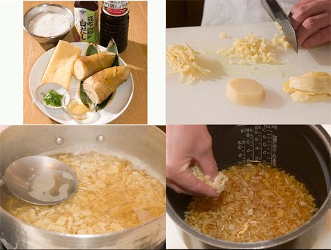 2. Pon el arroz en una cazuela y añade el caldo dashi, la salsa de soja, el sake y el mirin. Coloca el bambú y el aburaage por encima. Comienza a cocinar el arroz.