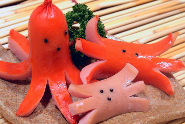 4. Con el centro de la salchicha, cortalo por la mitad longitudinalmente. En cada una de las dos puntas hazle 5 cortes como haciendole flecos (ver video). Hazle 2 ojitos también si quieres con un palillo.