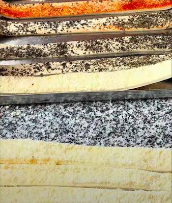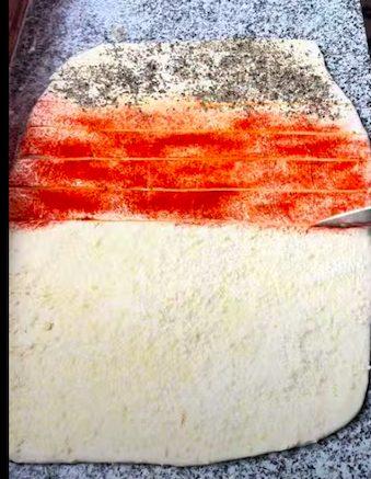 Estirar un rectángulo de 1 cm de espesor, pintar con aceite y distribuir los sabores, Cortar tiras anchas y dejar descansar 20 minutos.