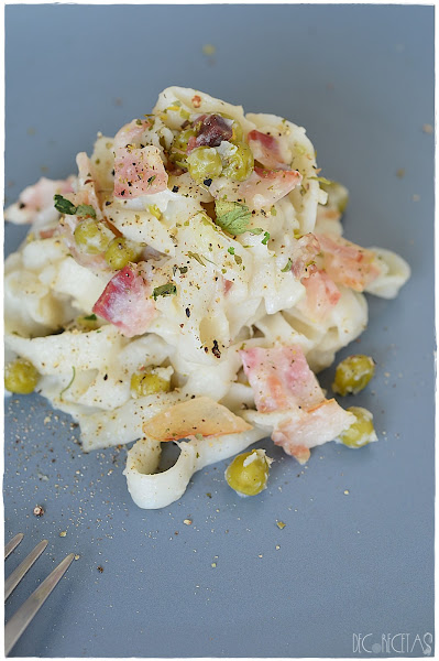 En un wok doramos 3 lonchas de beicon de pavo y añadimos 100gr de guisantes. Añadimos igualmente medio paquete de tallarimis y salsa alfredo al gusto para emplatar