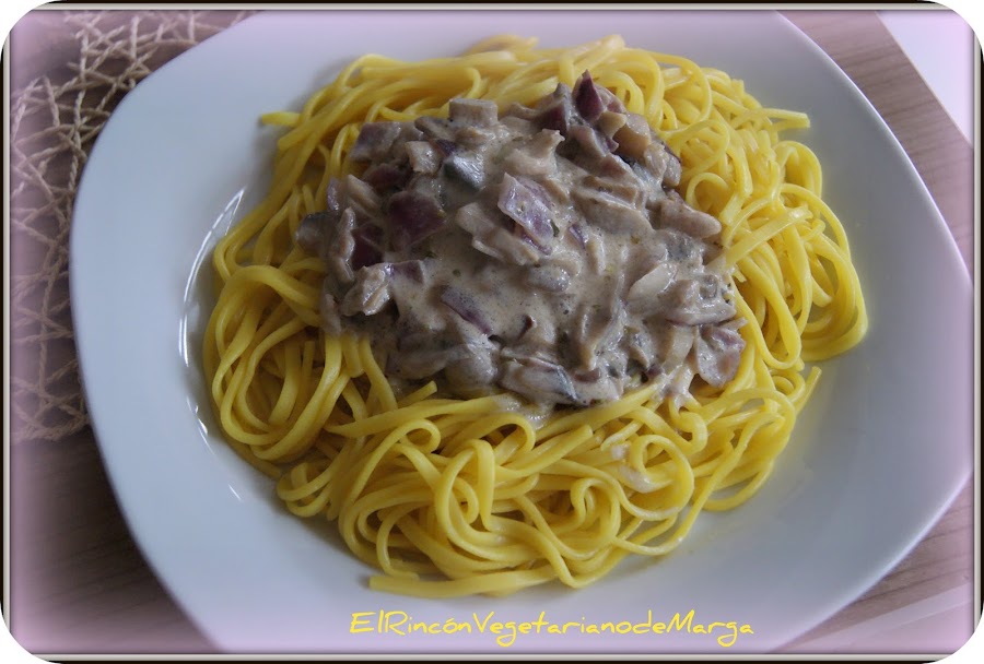 La receta que hoy; una receta muy fácil de hacer, pero con un sabor distinto, ya que son tallarines con sabor a cúrcuma (o quien lo prefiera, curry) y con una carbonara de cebolla morada, champiñones y nata (crema de leche) de avena. Espero que os guste. Los tallarines mucho mejor si son integrales, ya que aportan más nutrientes y fibra, lo que a mi hoy no me quedaban. Me ha gustado mucho el contraste del amarillo de los tallarines con la salsa color morado.