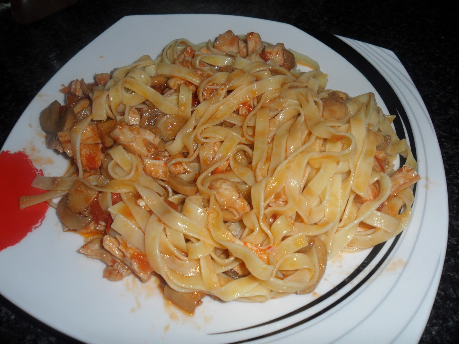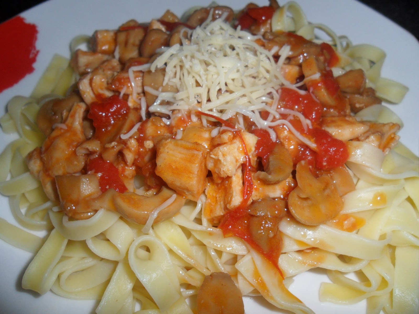 6º - Añadimos el pollo a la sartén de la salsa cocinamos 5 minutos más y servimos los tallarines con la salsa por encima y con el queso parmesano espolvoreado por encima .