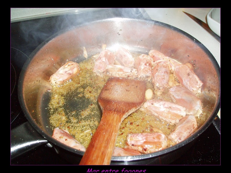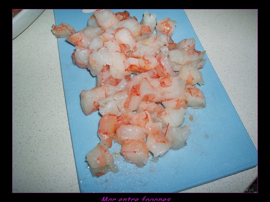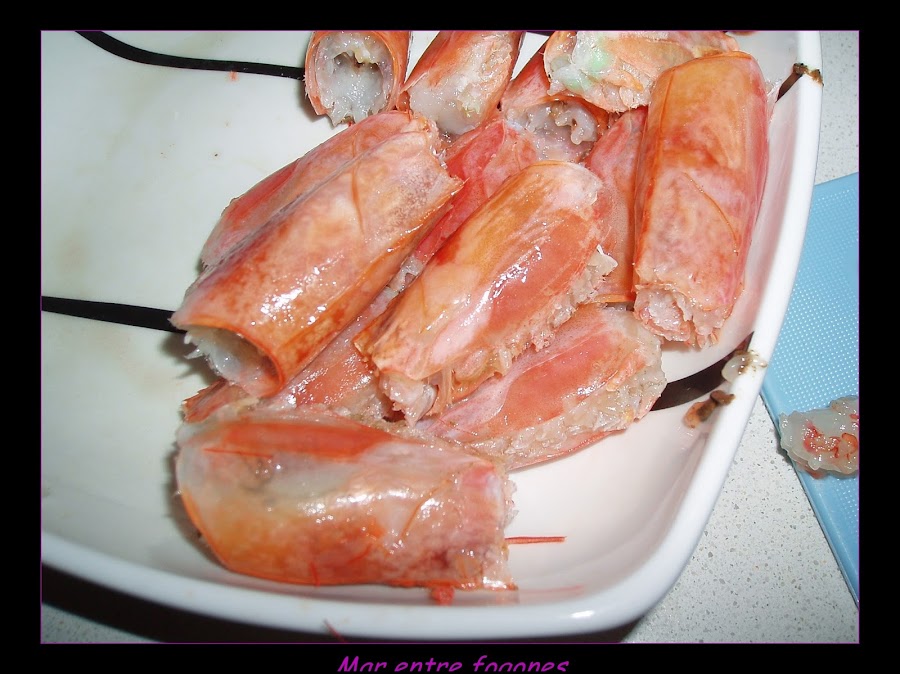 Cuando están cocinadas las sacamos y en ese aceite echamos los gambones pelados y partidos.