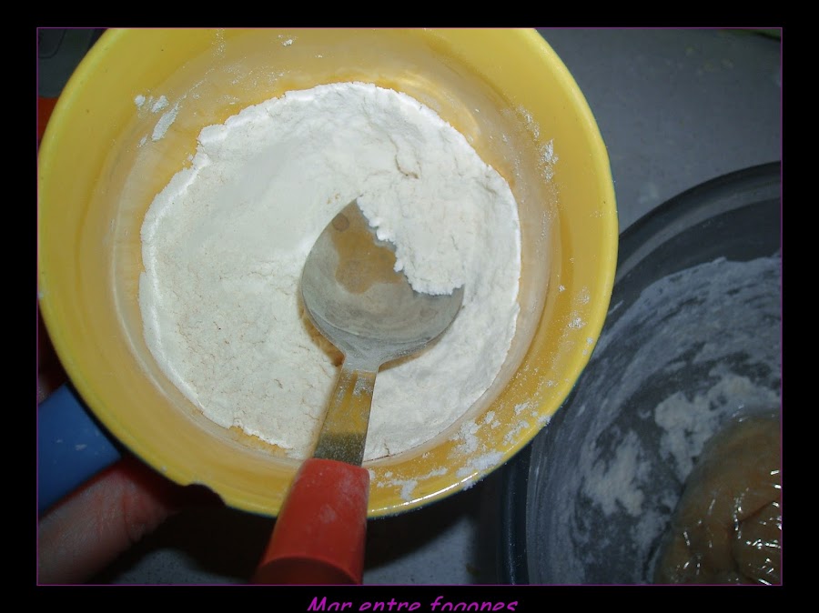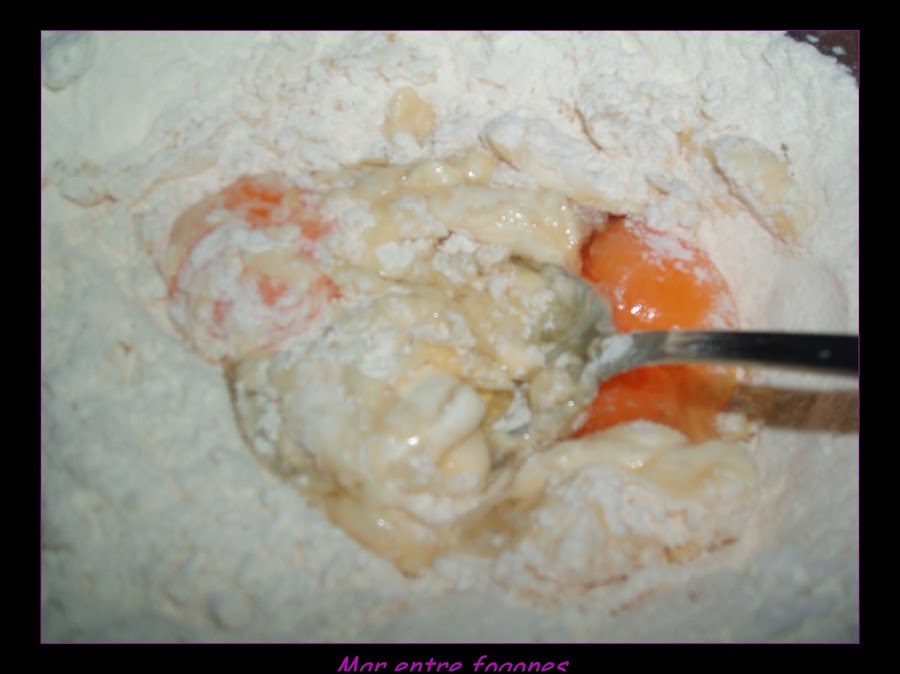 En la harina de la fuente grande, hacemos un agujero en el centro.