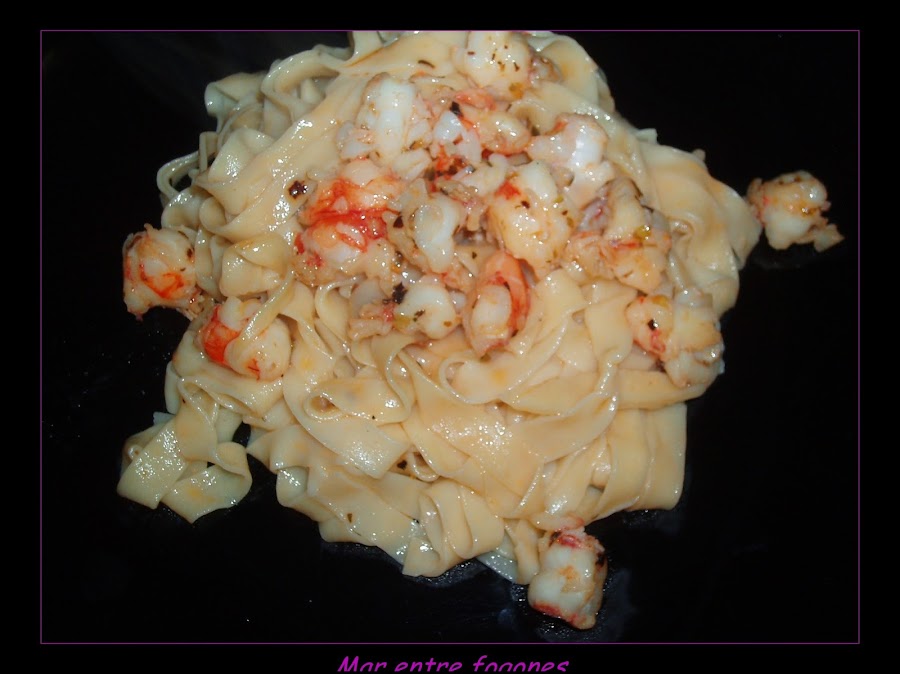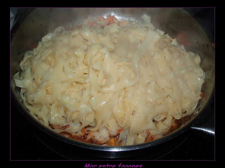 Echamos la pasta en los gambones, mezclamos bien y servimos.