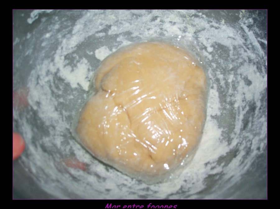 Envolvemos la bola en film transparente y la metemos en la nevera mínimo 1 hora. (yo la dejé toda la noche porque la hice tarde y no me daba tiempo a cortar la pasta).