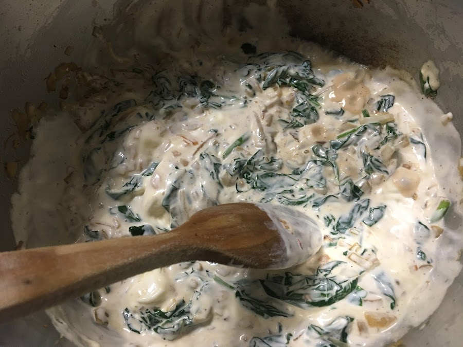 Una vez tenemos la cebolla pochada y las espinacas reducidas, pondremos la nata (crema de leche) fresca y removeremos.