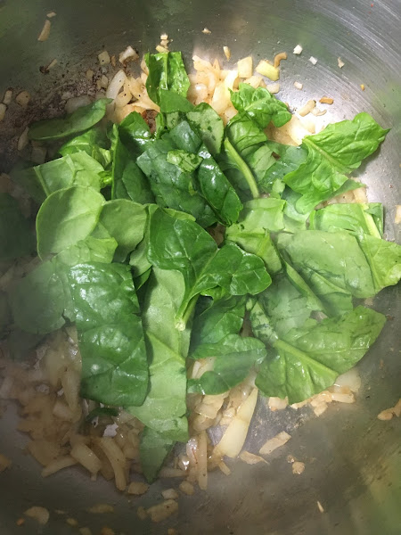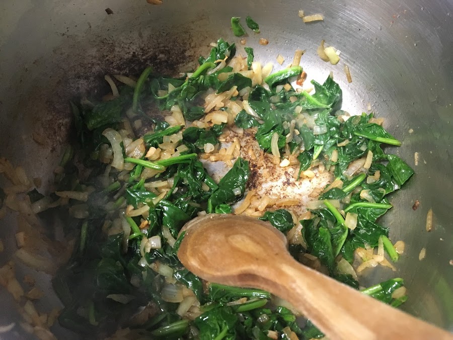 Introducimos la cebolla picada en la olla dejamos que se vaya dorando mientras vamos removiendo. Cuando vemos que la cebolla se está empezando a dorar podemos añadir las espinacas.