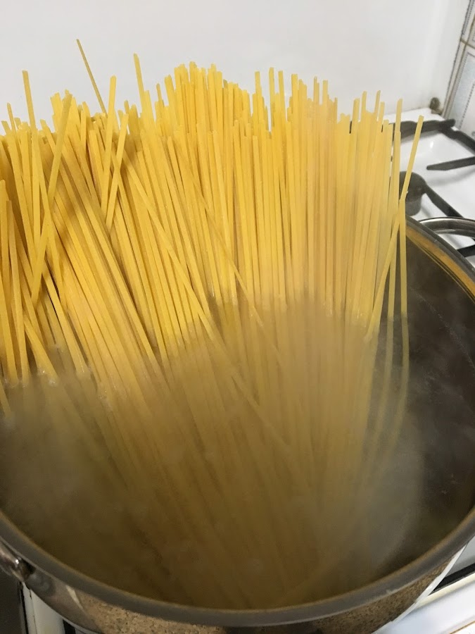 Ponemos abundante agua en una olla. Cuando esté hirviendo le introducimos los tallarines y un buen puñado de sal.