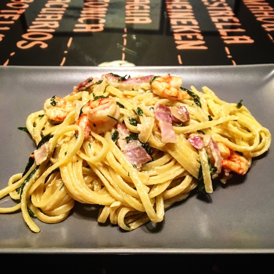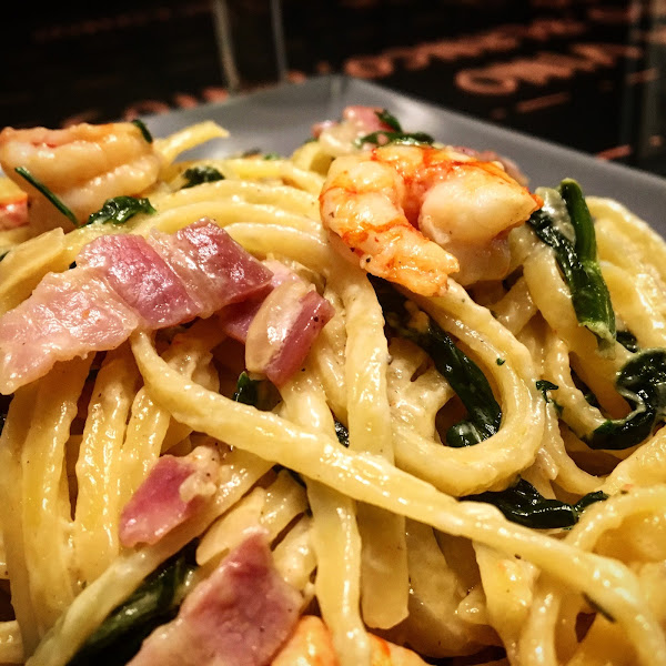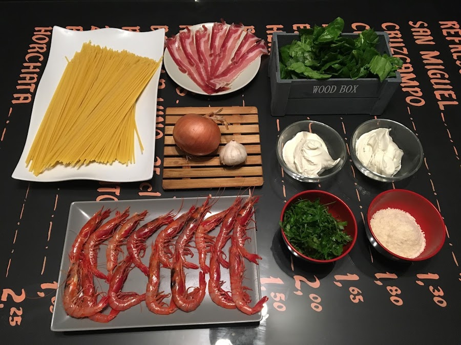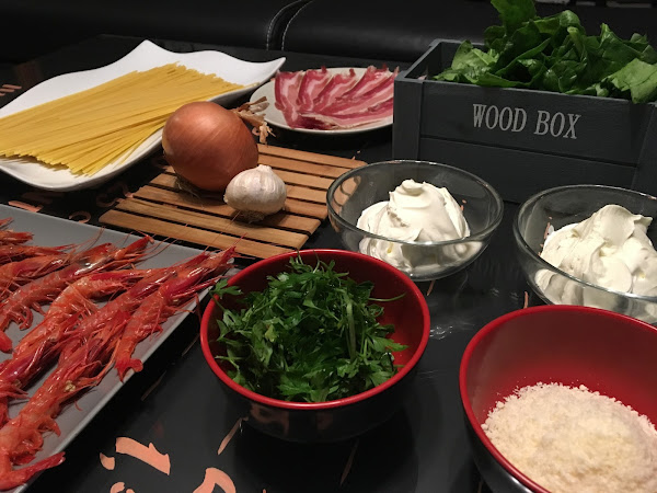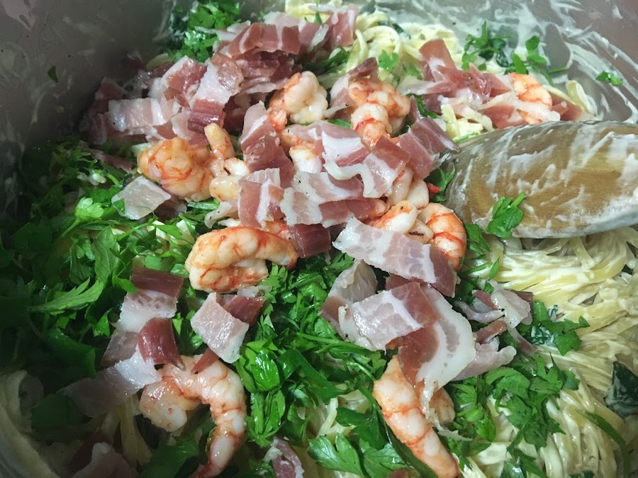 Cuando ya tenemos los tallarines con la nata (crema de leche) será el momento de añadirle las gambas, un puñado de perejil picado, dos tazas de queso gran padano y las lonchas de bacon cortadas en tacos.