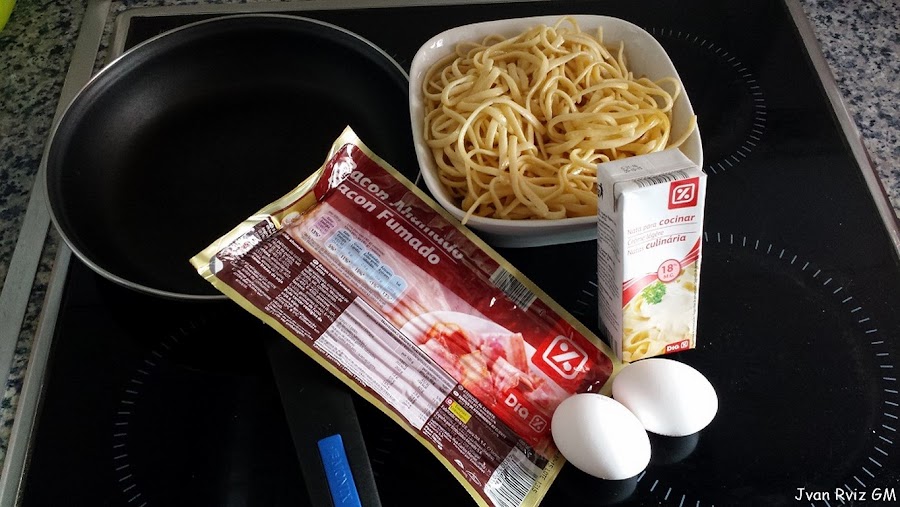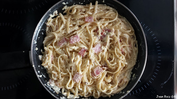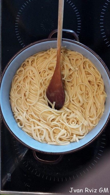 Ponemos el fuego al medio, batimos los huevos y le añadimos la nata (crema de leche) y se lo añadimos a los tallarines y removemos bien.