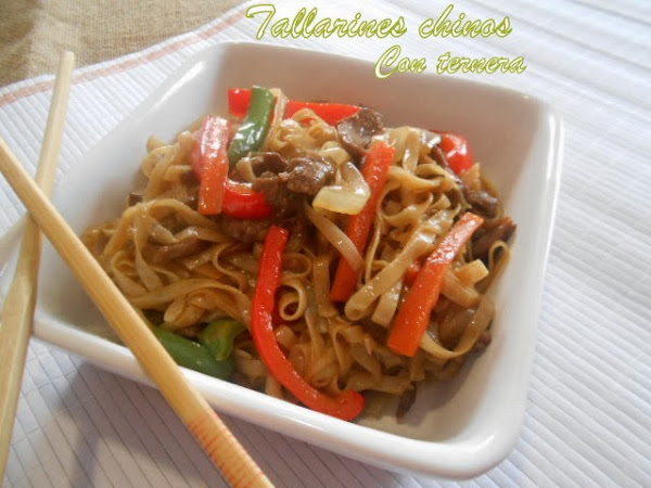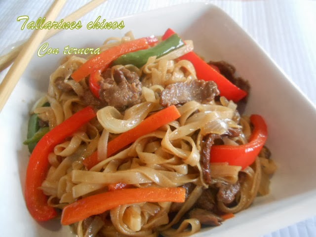 Ahora agregar la ternera y los tallarines,mezclamos unos dos minutos para que los tallarines se impregnen bien de las salsa y especias.